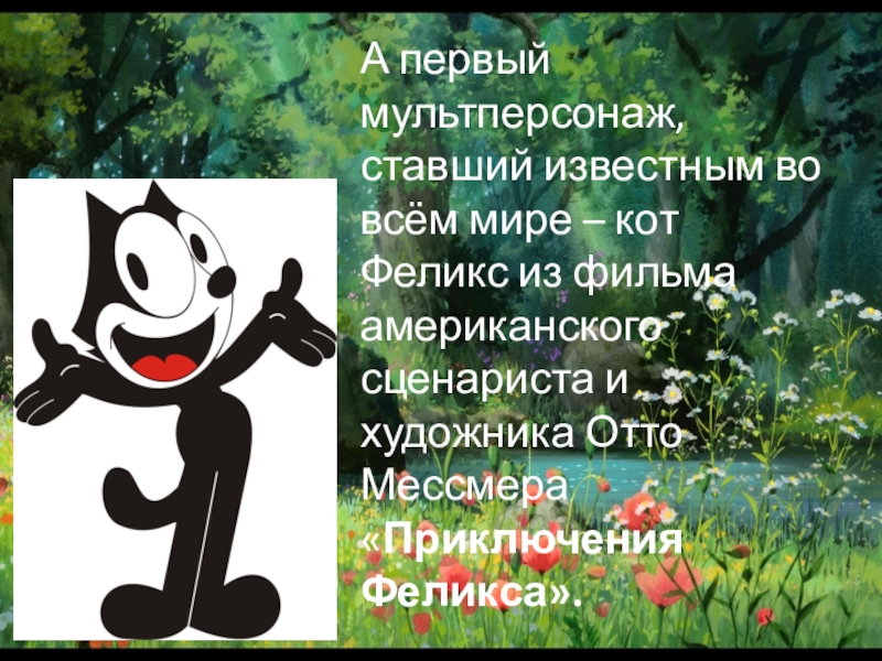 Слайд 6А первый мультперсонаж, ставший известным во всём мире – кот Феликс