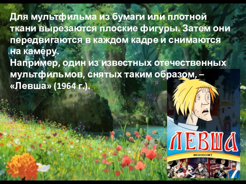Например, один из известных отечественных мультфильмов, снятых таким образом, – «Левша» (1964 г.).