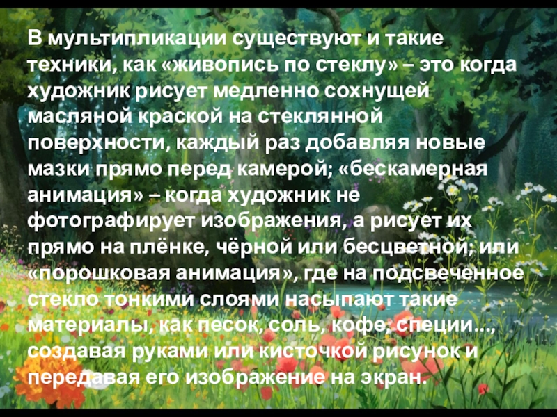 Слайд 10В мультипликации существуют и такие техники, как «живопись по стеклу» –