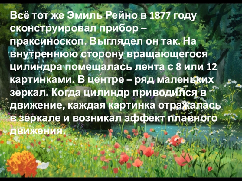 праксиноскоп. Выглядел он так. На внутреннюю сторону вращающегося цилиндра помещалась лента с 8 или 12 картинками. В центре – ряд маленьких зеркал. Когда цилиндр приводился в движение, каждая картинка отражалась в зеркале и возникал эффект плавного движения.