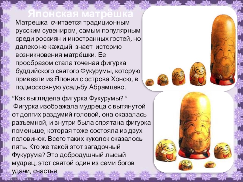 Матрешка считается традиционным русским сувениром, самым популярным среди россиян и иностранных гостей, но далеко не каждый знает историю возникновения матрёшки. Ее прообразом стала точеная фигурка буддийского святого Фукурумы, которую привезли из Японии с острова Хонсю, в подмосковную усадьбу Абрамцево.