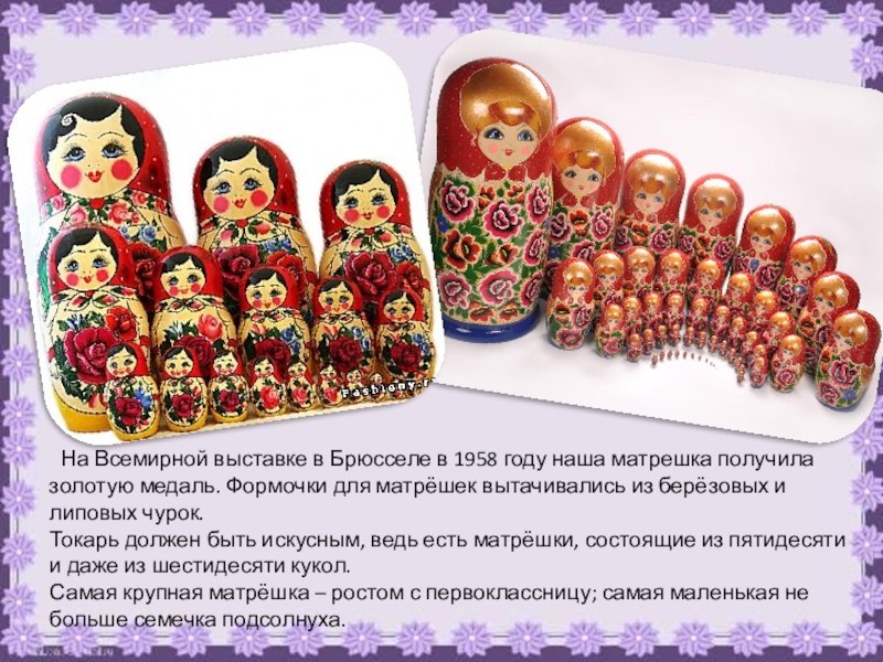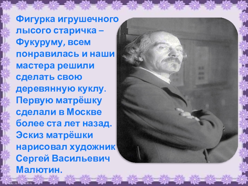 Первую матрёшку сделали в Москве более ста лет назад. Эскиз матрёшки нарисовал художник Сергей Васильевич Малютин.