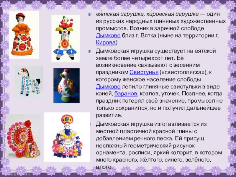 Дымковская игрушка изготавливается из местной пластичной красной глины с добавлением речного песка. Ей присущ несложный геометрический рисунок орнамента, росписи, яркий колорит, в котором много красного, жёлтого, синего, зелёного, алого.