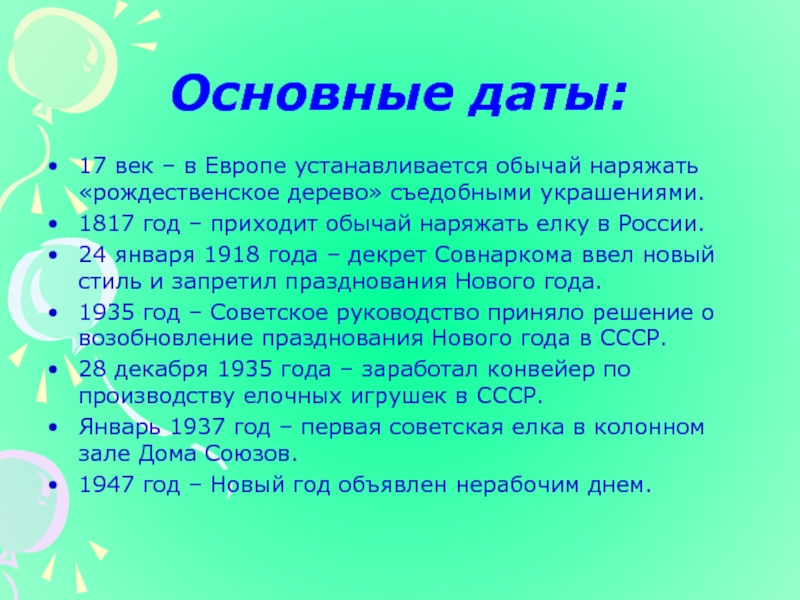 1935 год – Советское руководство приняло решение о возобновление празднования Нового года в СССР.