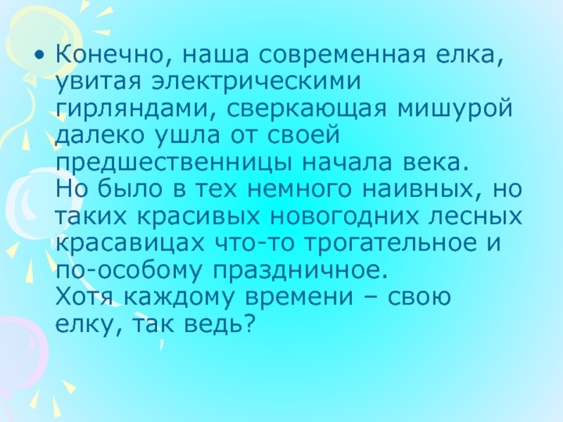 Слайд 19Конечно, наша современная елка, увитая электрическими гирляндами, сверкающая мишурой далеко ушла