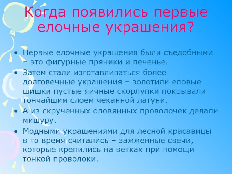 Слайд 2Когда появились первые елочные украшения?