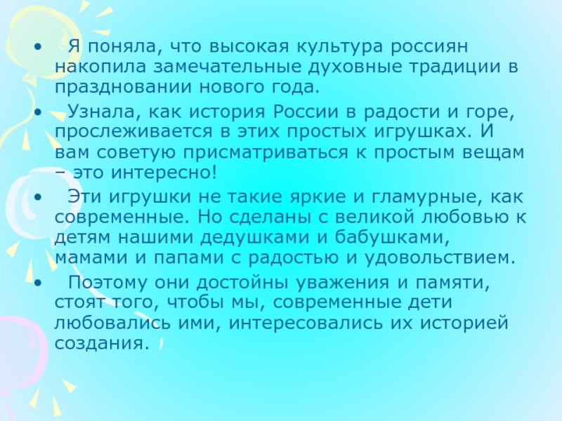 Слайд 21 Я поняла, что высокая культура россиян накопила замечательные духовные традиции
