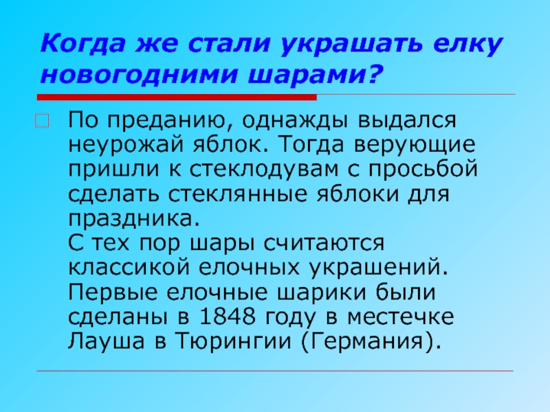яблок. Тогда верующие пришли к стеклодувам с просьбой сделать стеклянные яблоки для праздника. С тех пор шары считаются классикой елочных украшений. Первые елочные шарики были сделаны в 1848 году в местечке Лауша в Тюрингии (Германия).
