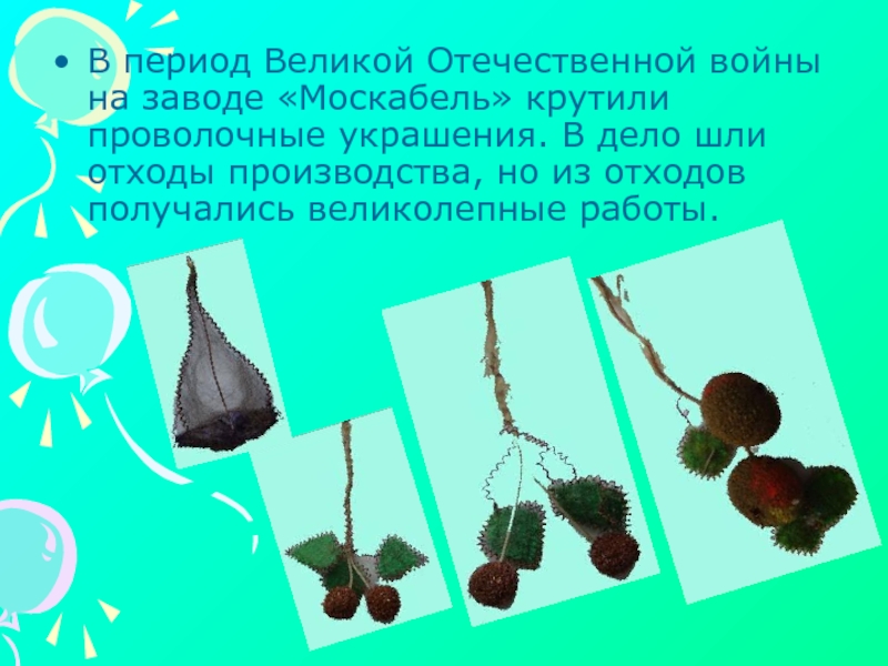 Слайд 5В период Великой Отечественной войны на заводе «Москабель» крутили проволочные украшения.