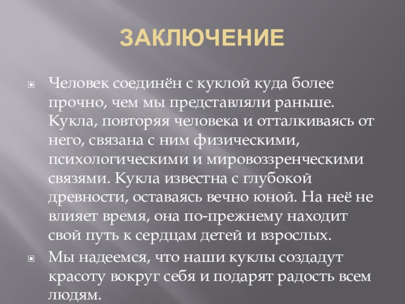 ЗАКЛЮЧЕНИЕЧеловек соединён с куклой куда более прочно, чем мы представляли раньше. Кукла, повторяя человека и отталкиваясь от
