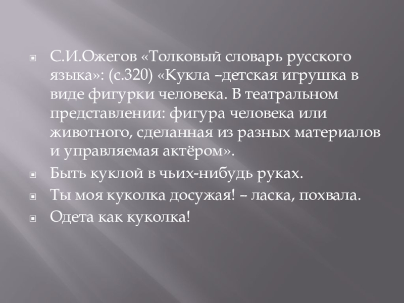 Слайд 5С.И.Ожегов «Толковый словарь русского языка»: (с.320) «Кукла –детская игрушка в виде