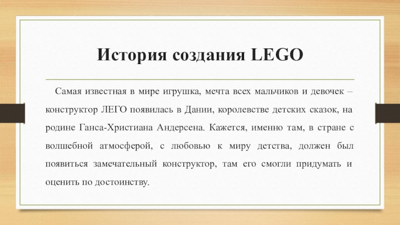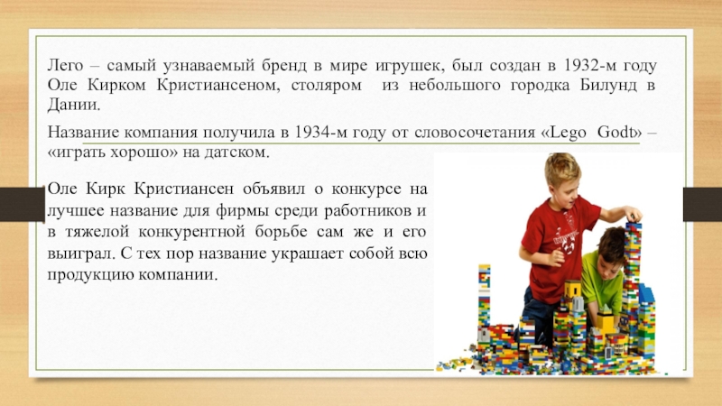 Оле Кирк Кристиансен объявил о конкурсе на лучшее название для фирмы среди работников и в тяжелой конкурентной борьбе сам же и его выиграл. С тех пор название украшает собой всю продукцию компании.