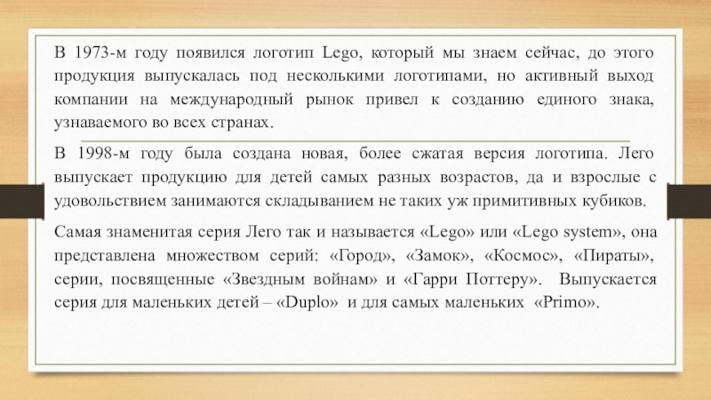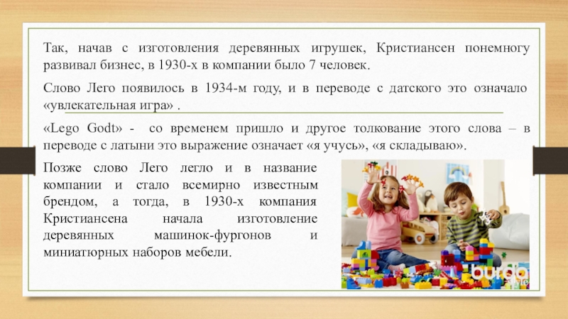Позже слово Лего легло и в название компании и стало всемирно известным брендом, а тогда, в 1930-х компания Кристиансена начала изготовление деревянных машинок-фургонов и миниатюрных наборов мебели.