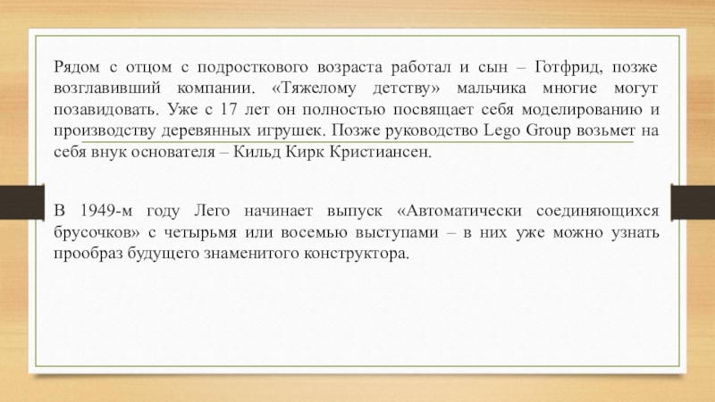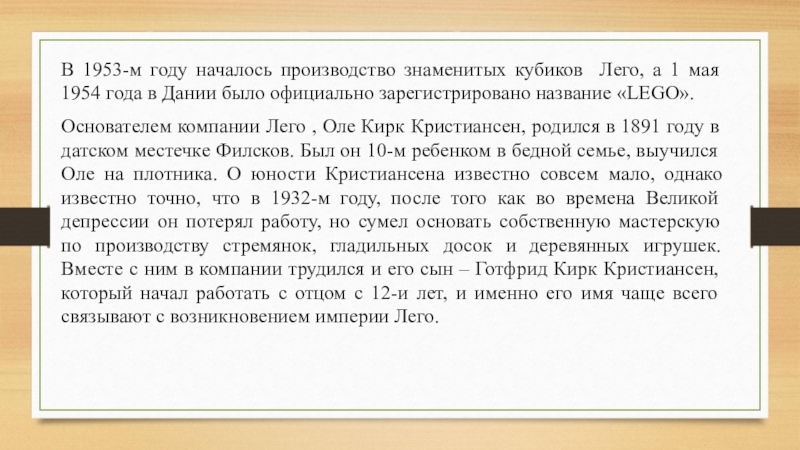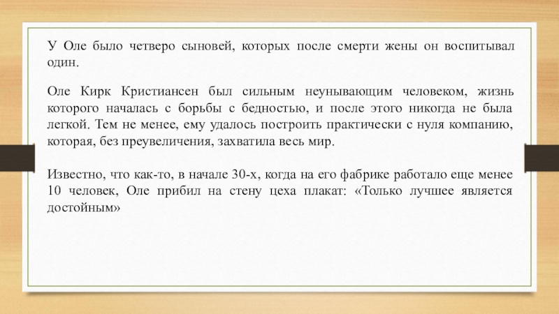 Оле Кирк Кристиансен был сильным неунывающим человеком, жизнь которого началась с борьбы с бедностью, и после этого никогда не была легкой. Тем не менее, ему удалось построить практически с нуля компанию, которая, без преувеличения, захватила весь мир.