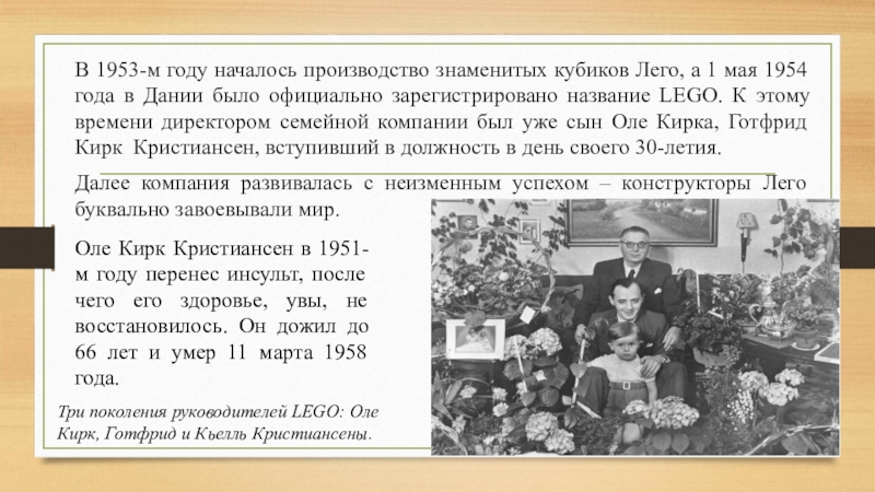 Оле Кирк Кристиансен в 1951-м году перенес инсульт, после чего его здоровье, увы, не восстановилось. Он дожил до 66 лет и умер 11 марта 1958 года.