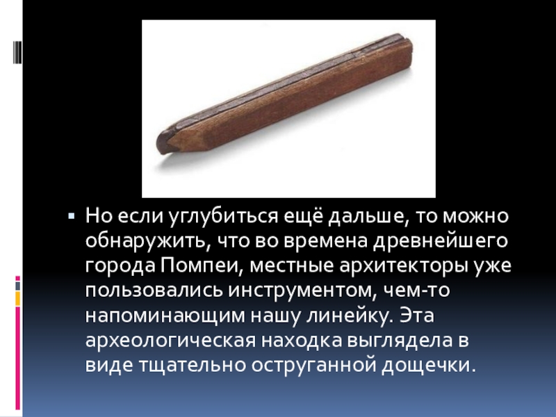 древнейшего города Помпеи, местные архитекторы уже пользовались инструментом, чем-то напоминающим нашу линейку. Эта археологическая находка выглядела в виде тщательно оструганной дощечки.