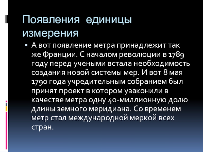 Появления единицы измерения  А вот появление метра принадлежит так же Франции. С началом революции в 1789