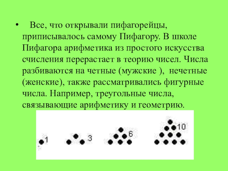 арифметика из простого искусства счисления перерастает в теорию чисел. Числа разбиваются на четные (мужские ), нечетные (женские), также рассматривались фигурные числа. Например, треугольные числа, связывающие арифметику и геометрию.