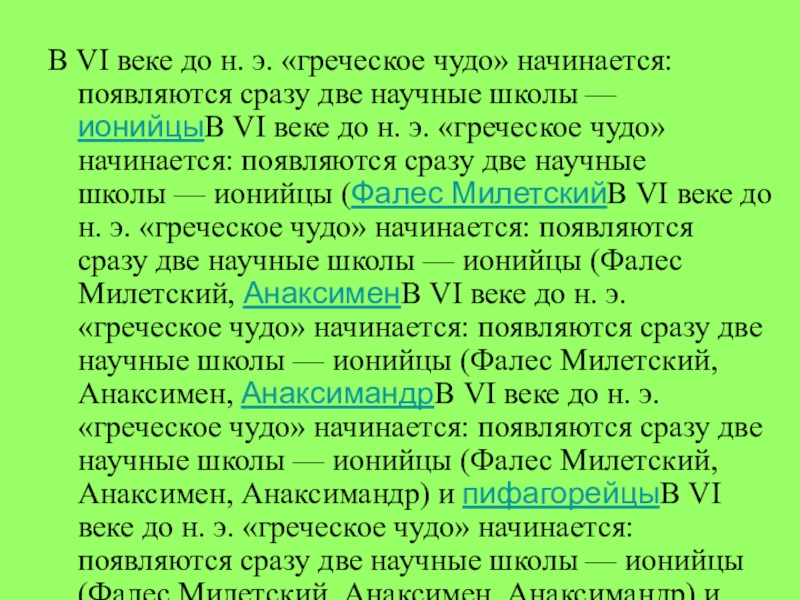 научные школы — ионийцыВ VI веке до н. э. «греческое чудо» начинается: появляются сразу две научные школы — ионийцы (Фалес МилетскийВ VI веке до н. э. «греческое чудо» начинается: появляются сразу две научные школы — ионийцы (Фалес Милетский, АнаксименВ VI веке до н. э. «греческое чудо» начинается: появляются сразу две научные школы — ионийцы (Фалес Милетский, Анаксимен, АнаксимандрВ VI веке до н. э. «греческое чудо» начинается: появляются сразу две научные школы — ионийцы (Фалес Милетский, Анаксимен, Анаксимандр) и пифагорейцыВ VI веке до н. э. «греческое чудо» начинается: появляются сразу две научные школы — ионийцы (Фалес Милетский, Анаксимен, Анаксимандр) и пифагорейцы. О достижениях ранних греческих математиков мы знаем в основном по комментариям позднейших авторов, преимущественно ЕвклидаВ VI веке до н. э. «греческое чудо» начинается: появляются сразу две научные школы — ионийцы (Фалес Милетский, Анаксимен, Анаксимандр) и пифагорейцы. О достижениях ранних греческих математиков мы знаем в основном по комментариям позднейших авторов, преимущественно Евклида, ПлатонаВ VI веке до н. э. «греческое чудо» начинается: появляются сразу две научные школы — ионийцы (Фалес Милетский, Анаксимен, Анаксимандр) и пифагорейцы. О достижениях ранних греческих математиков мы знаем в основном по комментариям позднейших авторов, преимущественно Евклида, Платона и Аристотеля.