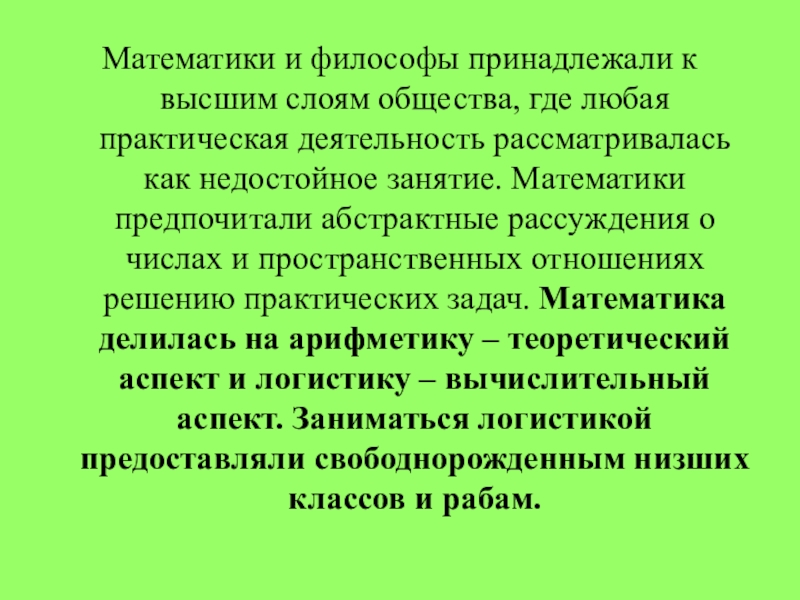 деятельность рассматривалась как недостойное занятие. Математики предпочитали абстрактные рассуждения о числах и пространственных отношениях решению практических задач. Математика делилась на арифметику – теоретический аспект и логистику – вычислительный аспект. Заниматься логистикой предоставляли свободнорожденным низших классов и рабам.