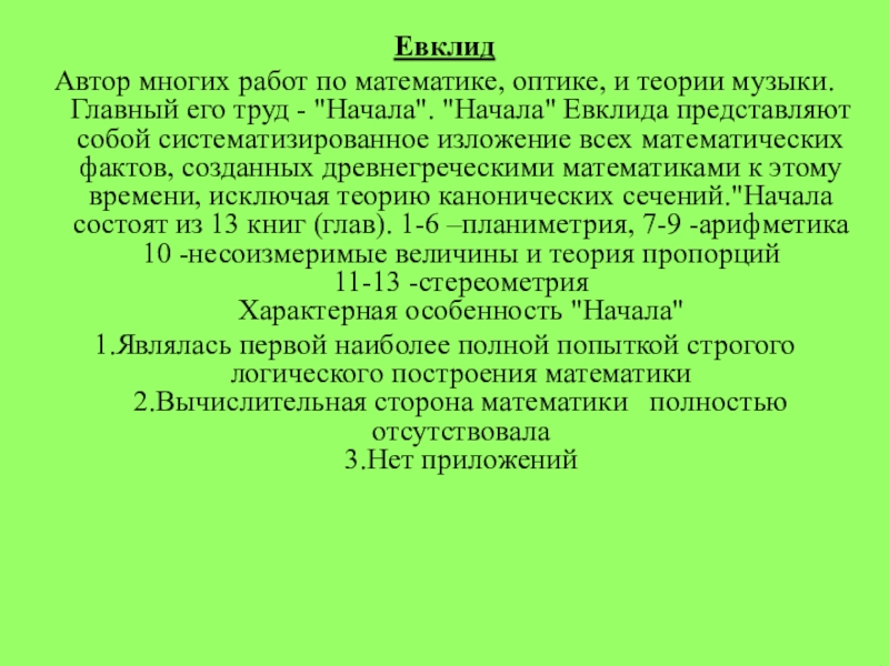 его труд - "Начала". "Начала" Евклида представляют собой систематизированное изложение всех математических фактов, созданных древнегреческими математиками к этому времени, исключая теорию канонических сечений."Начала состоят из 13 книг (глав). 1-6 –планиметрия, 7-9 -арифметика
