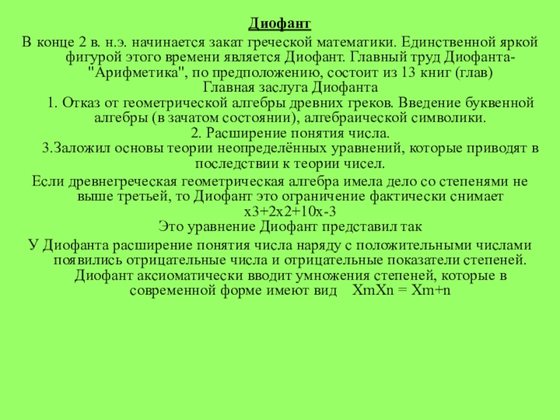 яркой фигурой этого времени является Диофант. Главный труд Диофанта- "Арифметика", по предположению, состоит из 13 книг (глав)