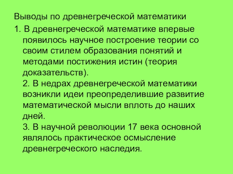Слайд 43Выводы по древнегреческой математики