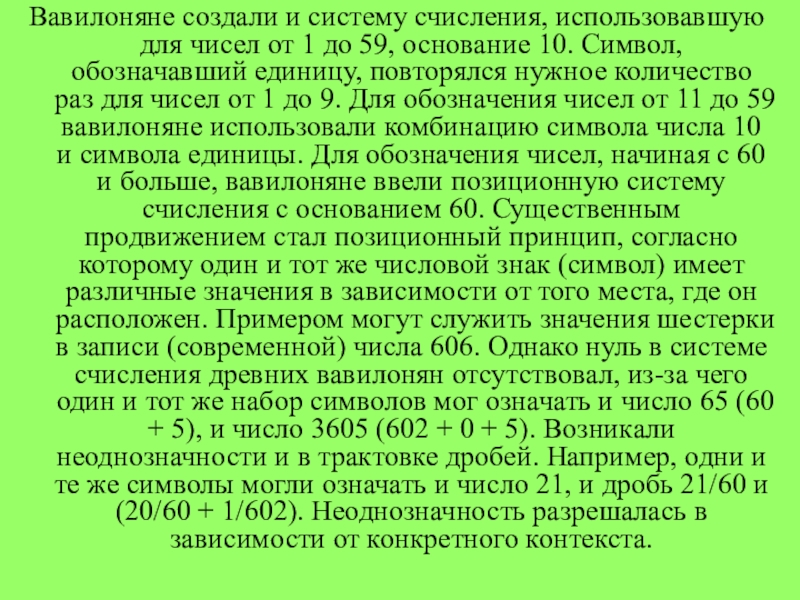 59, основание 10. Символ, обозначавший единицу, повторялся нужное количество раз для чисел от 1 до 9. Для обозначения чисел от 11 до 59 вавилоняне использовали комбинацию символа числа 10 и символа единицы. Для обозначения чисел, начиная с 60 и больше, вавилоняне ввели позиционную систему счисления с основанием 60. Существенным продвижением стал позиционный принцип, согласно которому один и тот же числовой знак (символ) имеет различные значения в зависимости от того места, где он расположен. Примером могут служить значения шестерки в записи (современной) числа 606. Однако нуль в системе счисления древних вавилонян отсутствовал, из-за чего один и тот же набор символов мог означать и число 65 (60 + 5), и число 3605 (602 + 0 + 5). Возникали неоднозначности и в трактовке дробей. Например, одни и те же символы могли означать и число 21, и дробь 21/60 и (20/60 + 1/602). Неоднозначность разрешалась в зависимости от конкретного контекста.