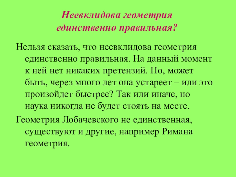 Нельзя сказать, что неевклидова геометрия единственно правильная. На