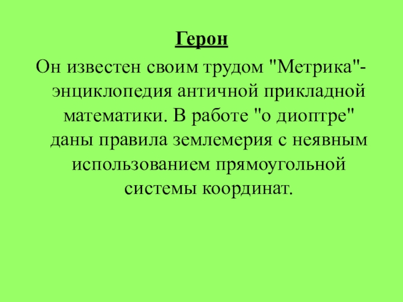 работе "о диоптре" даны правила землемерия с неявным использованием прямоугольной системы координат.