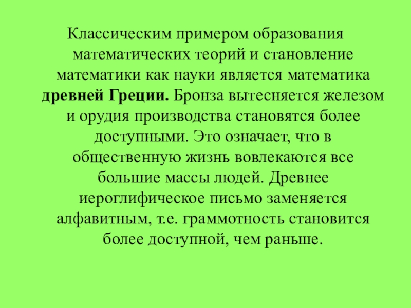 математика древней Греции. Бронза вытесняется железом и орудия производства становятся более доступными. Это означает, что в общественную жизнь вовлекаются все большие массы людей. Древнее иероглифическое письмо заменяется алфавитным, т.е. граммотность становится более доступной, чем раньше.