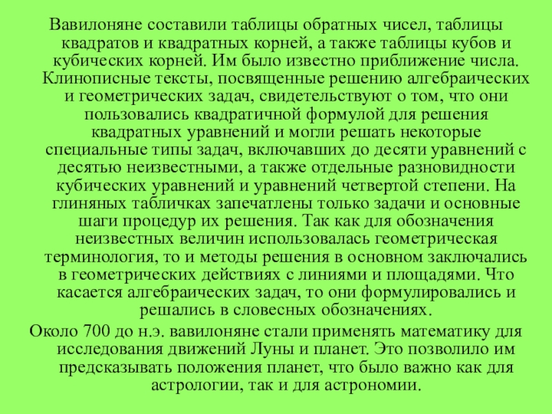 также таблицы кубов и кубических корней. Им было известно приближение числа. Клинописные тексты, посвященные решению алгебраических и геометрических задач, свидетельствуют о том, что они пользовались квадратичной формулой для решения квадратных уравнений и могли решать некоторые специальные типы задач, включавших до десяти уравнений с десятью неизвестными, а также отдельные разновидности кубических уравнений и уравнений четвертой степени. На глиняных табличках запечатлены только задачи и основные шаги процедур их решения. Так как для обозначения неизвестных величин использовалась геометрическая терминология, то и методы решения в основном заключались в геометрических действиях с линиями и площадями. Что касается алгебраических задач, то они формулировались и решались в словесных обозначениях.