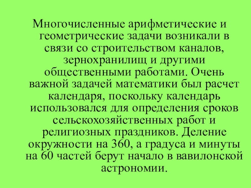 Слайд 5Многочисленные арифметические и геометрические задачи возникали в связи со строительством каналов,