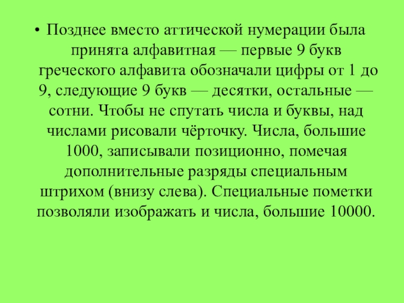 Слайд 32Позднее вместо аттической нумерации была принята алфавитная — первые 9 букв греческого