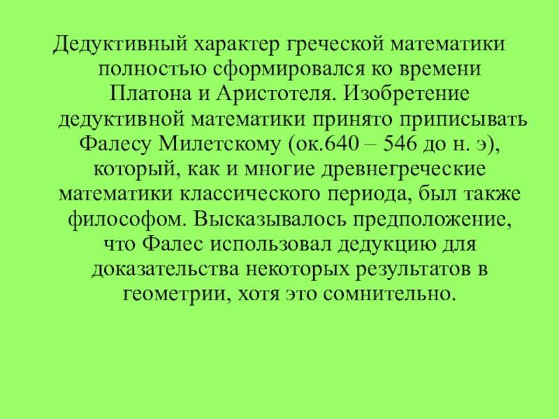 Слайд 34Дедуктивный характер греческой математики полностью сформировался ко времени Платона и Аристотеля.