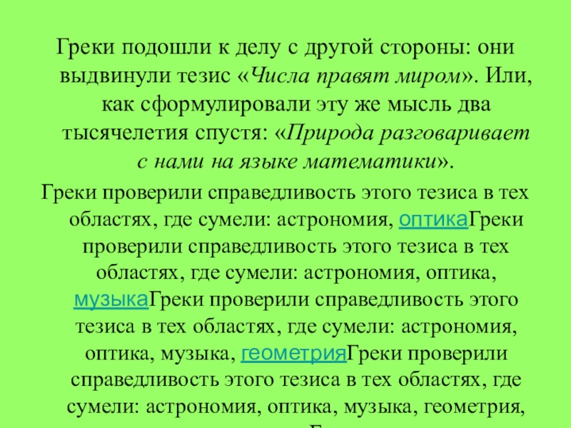 Греки проверили справедливость этого тезиса в тех областях, где сумели: астрономия, оптикаГреки проверили справедливость этого тезиса в тех областях, где сумели: астрономия, оптика, музыкаГреки проверили справедливость этого тезиса в тех областях, где сумели: астрономия, оптика, музыка, геометрияГреки проверили справедливость этого тезиса в тех областях, где сумели: астрономия, оптика, музыка, геометрия, позже — механикаГреки проверили справедливость этого тезиса в тех областях, где сумели: астрономия, оптика, музыка, геометрия, позже — механика. Всюду были отмечены впечатляющие успехи: математическая модель обладала неоспоримой предсказательной силой.