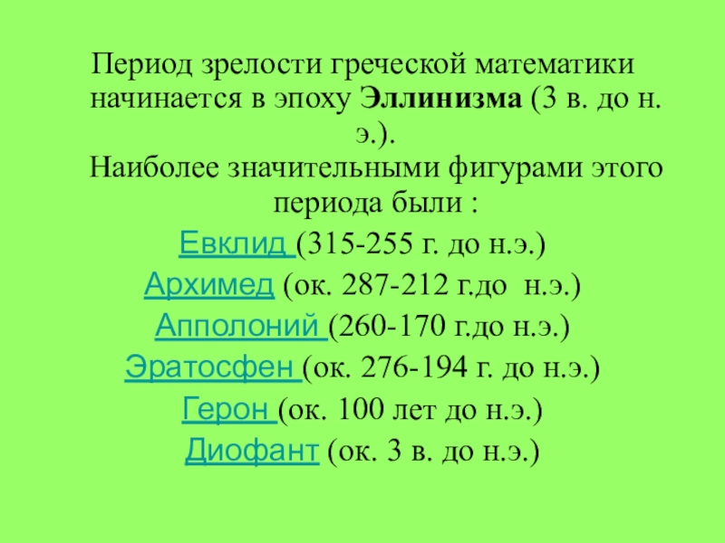 Слайд 21Период зрелости греческой математики начинается в эпоху Эллинизма (3 в. до