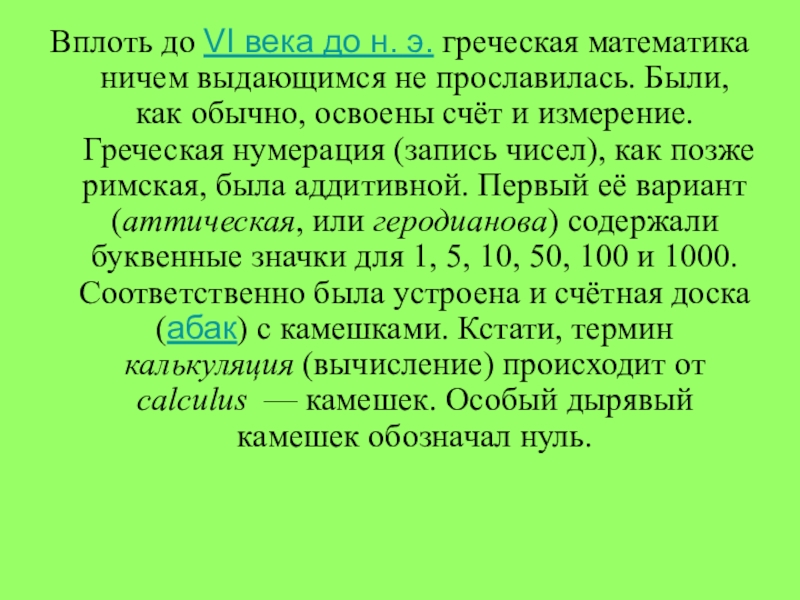 прославилась. Были, как обычно, освоены счёт и измерение. Греческая нумерация (запись чисел), как позже римская, была аддитивной. Первый её вариант (аттическая, или геродианова) содержали буквенные значки для 1, 5, 10, 50, 100 и 1000. Соответственно была устроена и счётная доска (абак) с камешками. Кстати, термин калькуляция (вычисление) происходит от calculus — камешек. Особый дырявый камешек обозначал нуль.