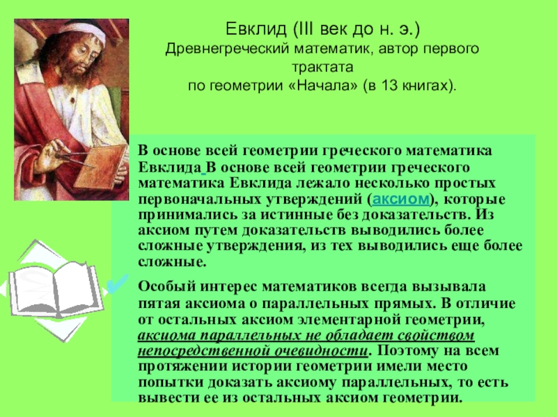 В основе всей геометрии греческого математика Евклида В основе всей геометрии греческого математика Евклида лежало несколько простых первоначальных утверждений (аксиом), которые принимались за истинные без доказательств. Из аксиом путем доказательств выводились более сложные утверждения, из тех выводились еще более сложные.