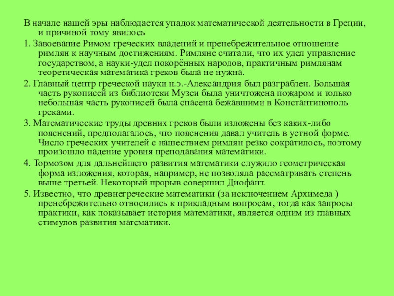 3. Математические труды древних греков были изложены без каких-либо пояснений, предполагалось, что пояснения давал учитель в устной форме. Число греческих учителей с нашествием римлян резко сократилось, поэтому произошло падение уровня преподавания математики.