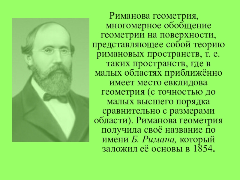 Слайд 39Риманова геометрия, многомерное обобщение геометрии на поверхности, представляющее собой теорию римановых