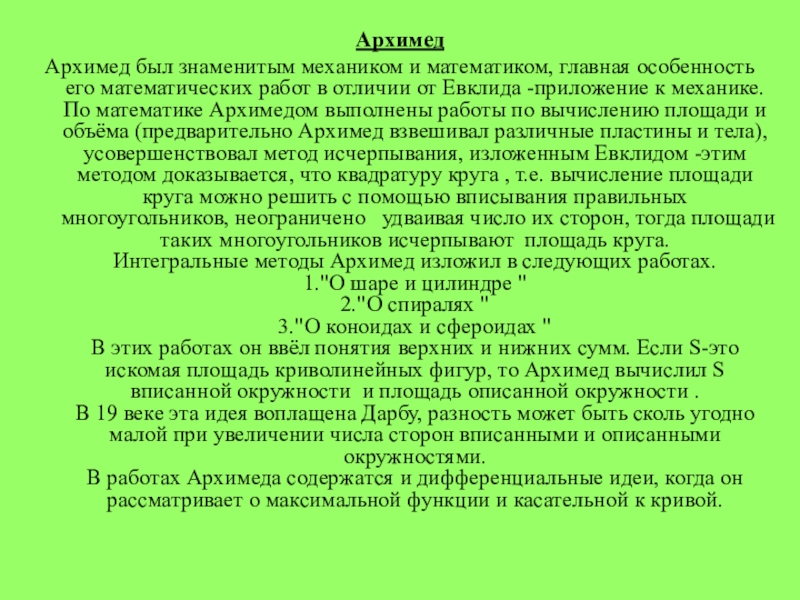 работ в отличии от Евклида -приложение к механике. По математике Архимедом выполнены работы по вычислению площади и объёма (предварительно Архимед взвешивал различные пластины и тела), усовершенствовал метод исчерпывания, изложенным Евклидом -этим методом доказывается, что квадратуру круга , т.е. вычисление площади круга можно решить с помощью вписывания правильных многоугольников, неограничено удваивая число их сторон, тогда площади таких многоугольников исчерпывают площадь круга.