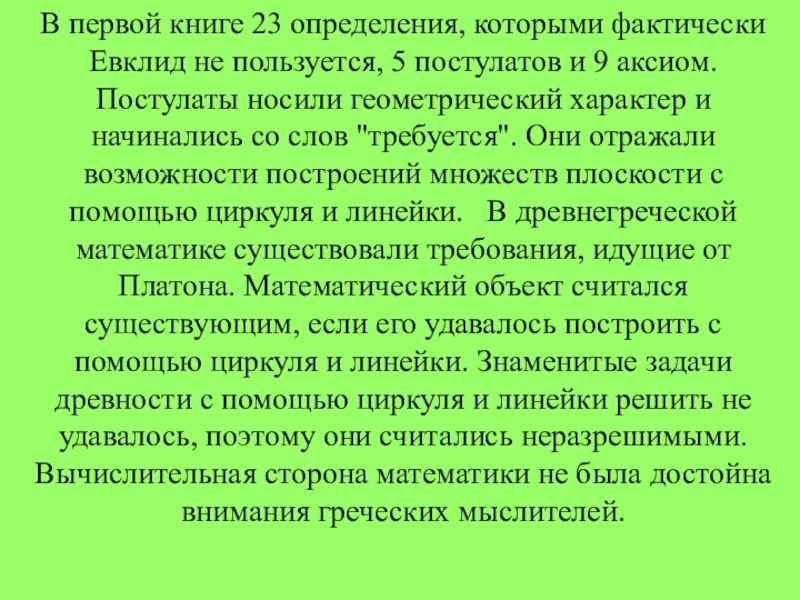 постулатов и 9 аксиом. Постулаты носили геометрический характер и начинались со слов "требуется". Они отражали возможности построений множеств плоскости с помощью циркуля и линейки. В древнегреческой математике существовали требования, идущие от Платона. Математический объект считался существующим, если его удавалось построить с помощью циркуля и линейки. Знаменитые задачи древности с помощью циркуля и линейки решить не удавалось, поэтому они считались неразрешимыми.