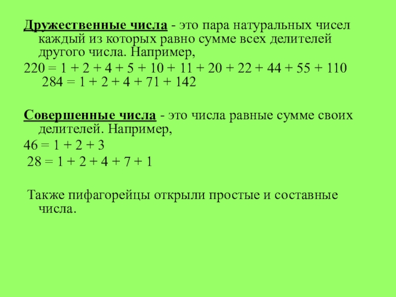 Слайд 18Дружественные числа - это пара натуральных чисел каждый из которых равно