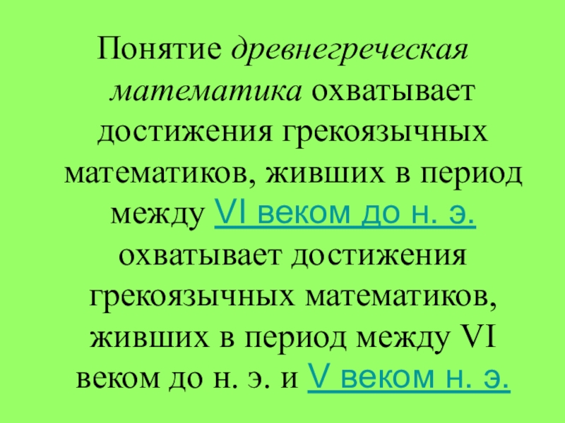 Слайд 9Понятие древнегреческая математика охватывает достижения грекоязычных математиков, живших в период между