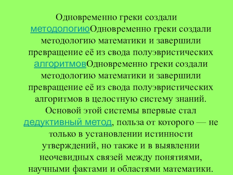 её из свода полуэвристических алгоритмовОдновременно греки создали методологию математики и завершили превращение её из свода полуэвристических алгоритмов в целостную систему знаний. Основой этой системы впервые стал дедуктивный метод, польза от которого — не только в установлении истинности утверждений, но также и в выявлении неочевидных связей между понятиями, научными фактами и областями математики.