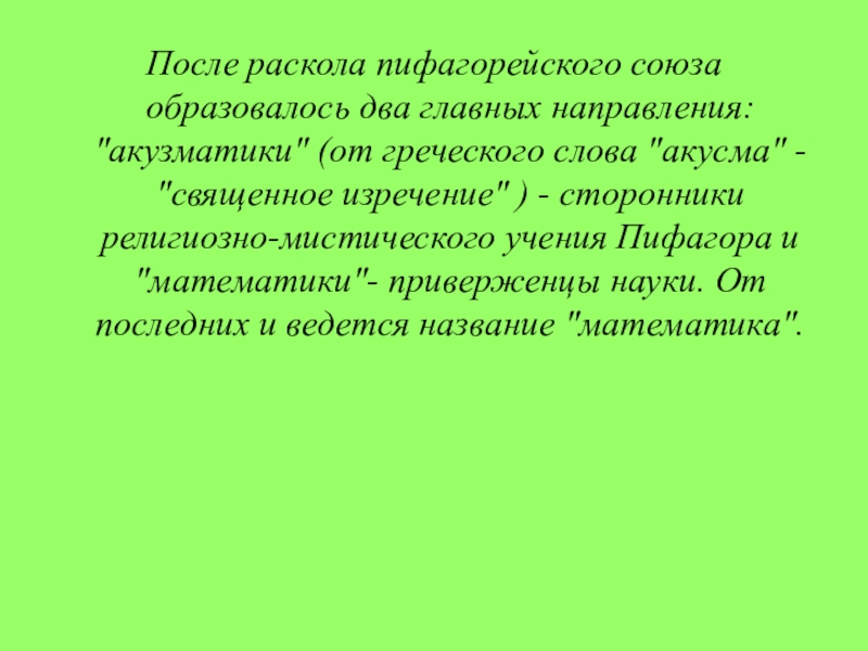 Слайд 14После раскола пифагорейского союза образовалось два главных направления: "акузматики" (от греческого