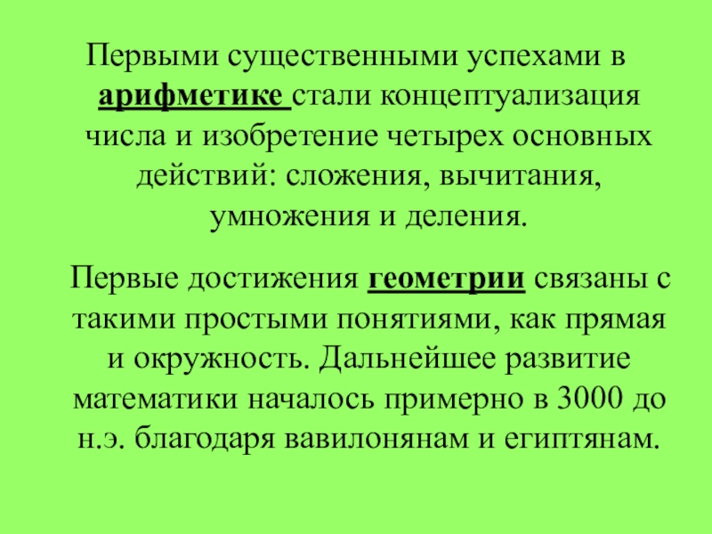Слайд 3Первыми существенными успехами в арифметике стали концептуализация числа и изобретение четырех