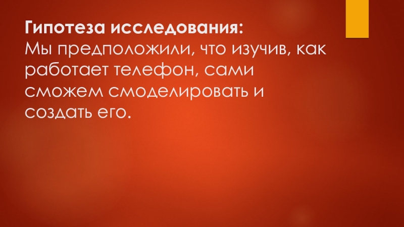 Слайд 7Гипотеза исследования: Мы предположили, что изучив, как работает телефон, сами сможем смоделировать