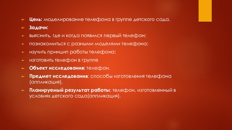 Цель: моделирование телефона в группе детского сада.Задачи:выяснить, где и когда появился первый телефон;познакомиться с разными моделями телефона;изучить принцип